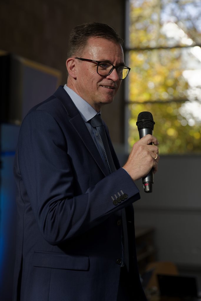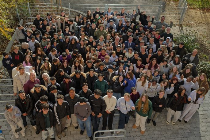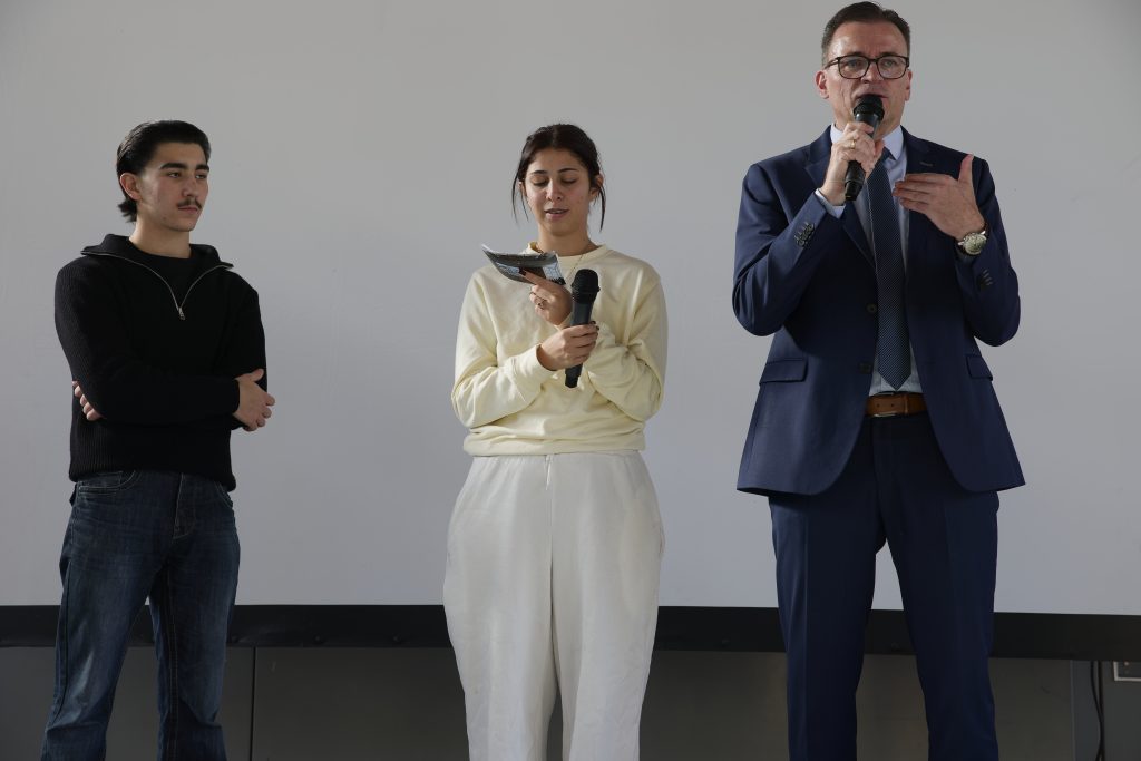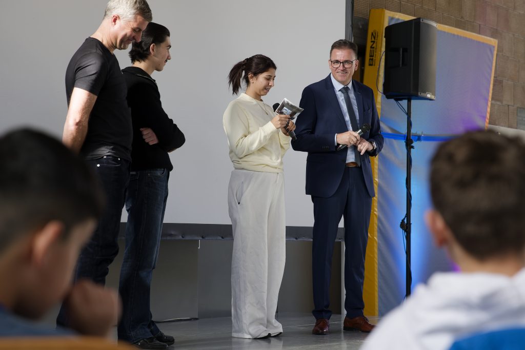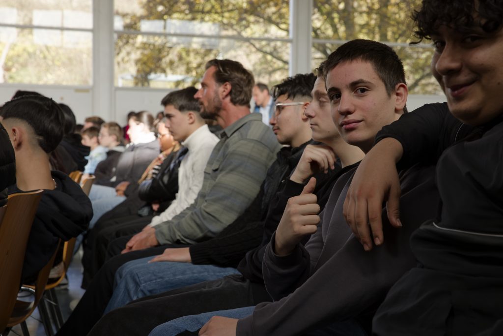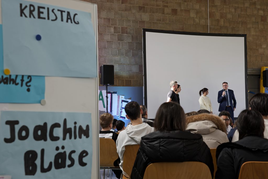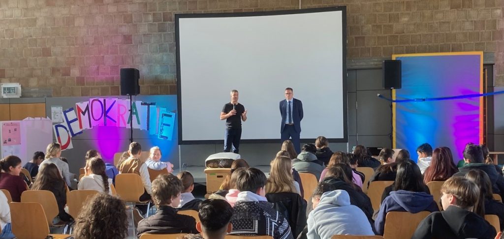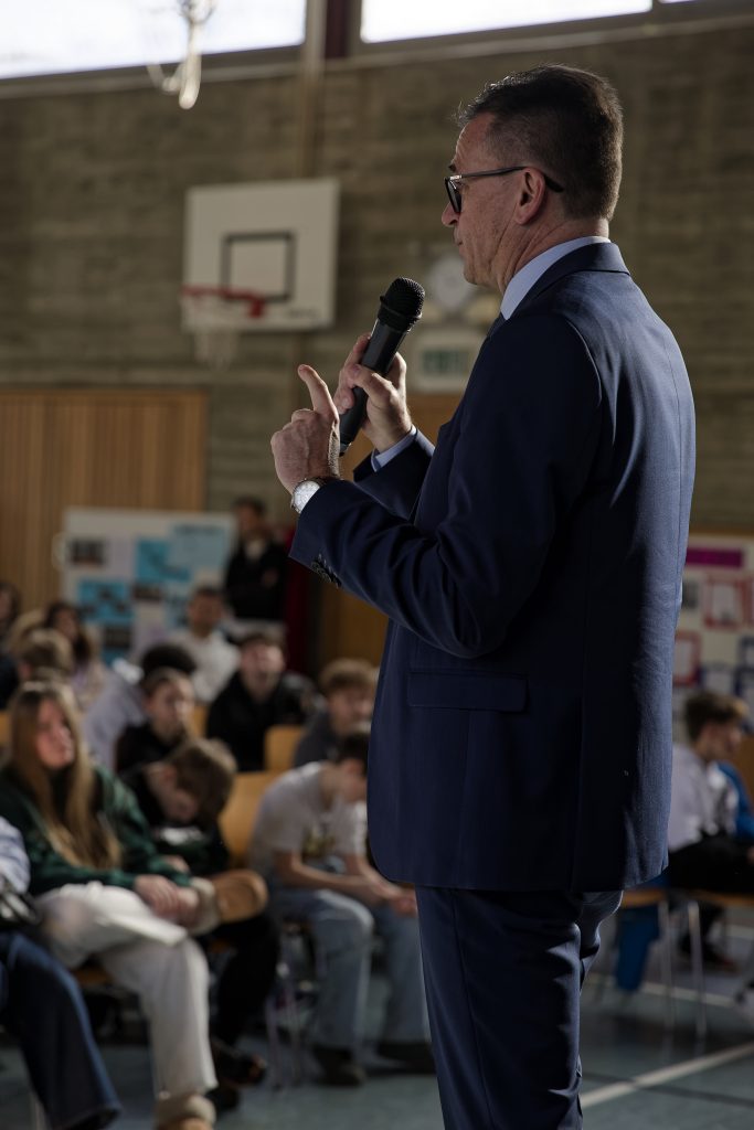 Besonderes Highlight war der Besuch von Landrat Dr. Joachim Bläse, der von Lehrer Sebastian Fritz vor der gesamten Sekundarstufe begrüßt wurde. In seiner Einführung sprach Fritz aktuelle Fragen an: Ob die Demokratie derzeit „unter Druck“ stehe und wie Kinder und Jugendliche – insbesondere jene mit Migrationsgeschichte – mit Begriffen wie Remigration oder Debatten um das Stadtbild umgehen sollen.
